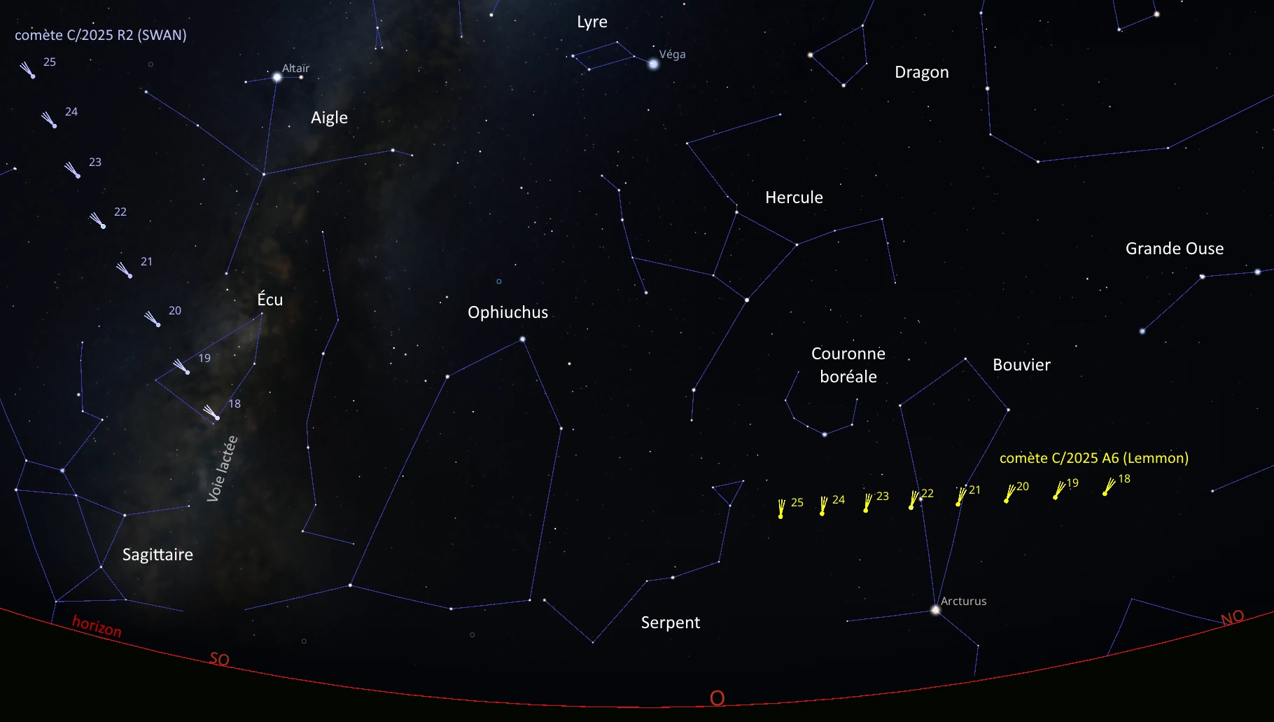 C’est une double bonne surprise pour les adeptes du ciel : les comètes C/2025 R2 (SWAN) et C/2025 A6 (Lemmon) pourront être observées en octobre avec de simples jumelles… et peut-être à l’oeil nu pour la seconde !