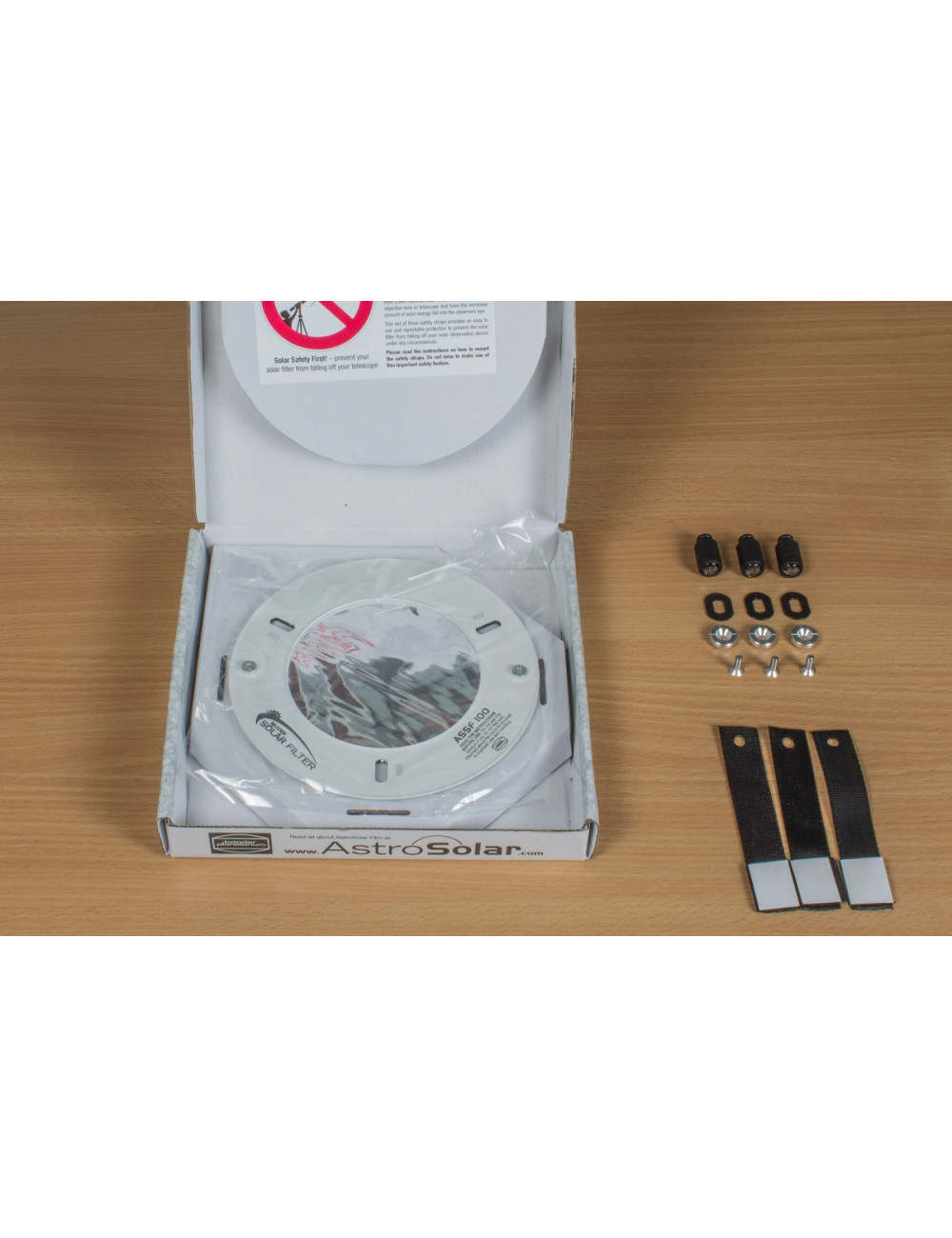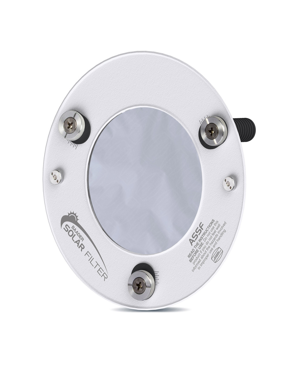 Les filtres solaires ASSF ont été conçus par Baader Planetarium, marque de référence, pour observer le Soleil en toute sécurité avec un petit télescope, une longue vue ou même un téléobjectif d’appareil photo. Ils existent en différents diamètres. Le modèle ASSF 65 a une ouverture utile de 65 mm et convient parfaitement au télescope mini-Dobson MaksyGo 60 ou à d’autres petits télescopes ou longues-vues de dimensions voisines (diamètre extérieur du tube : entre 70 et 85 mm).