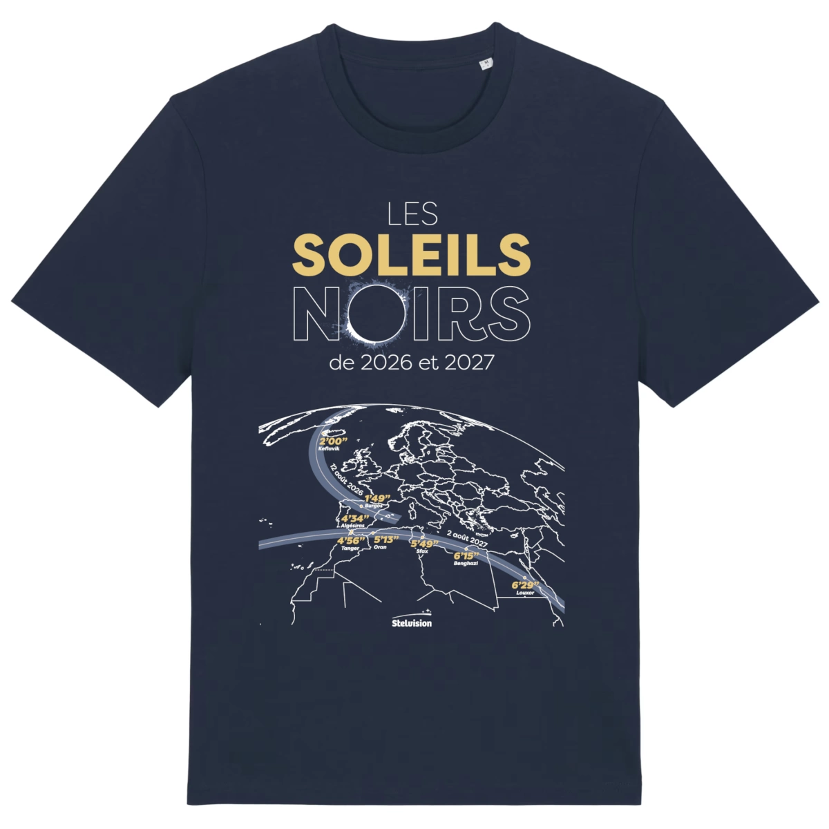 Ce T-shirt doit son nom et son graphisme à l’ouvrage de Jean-Marc Lecleire Les Soleils noirs de 2026 et 2027 édité par Stelvision. Mais attention, il ne s’agit pas d’un T-shirt publicitaire ou éphémère mais bien d’un vêtement durable :