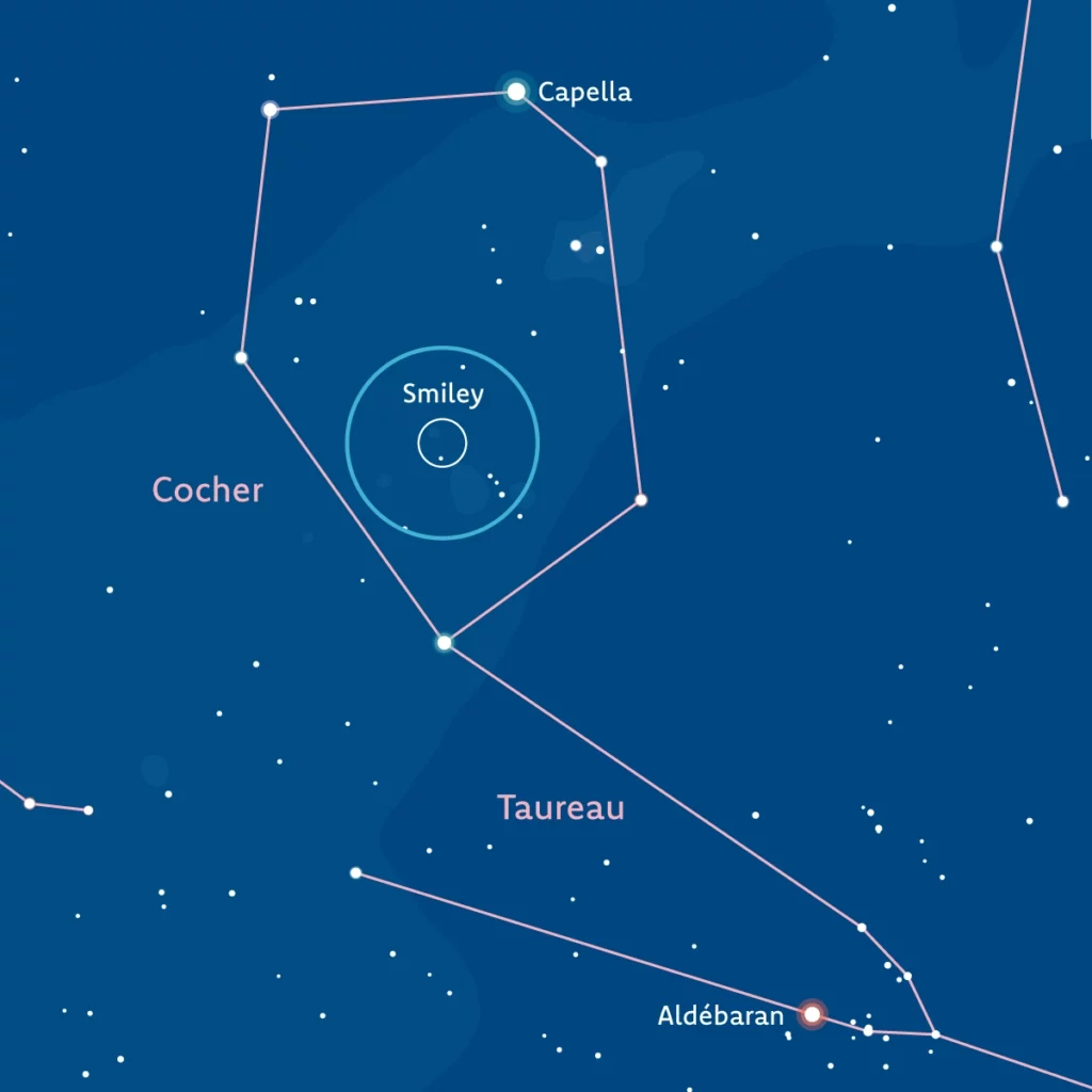 Au cœur de la constellation du Cocher, voici une forme amusante du ciel d’hiver : le Smiley.