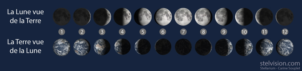 Aspects de la Lune vue depuis la Terre et inversement. Pour un instant donné, la portion éclairée de la Terre est l’exact inverse de la portion éclairée de la Lune. La numérotation correspond aux positions Terre-Lune dans l’illustration précédente. Cliquez pour agrandir.