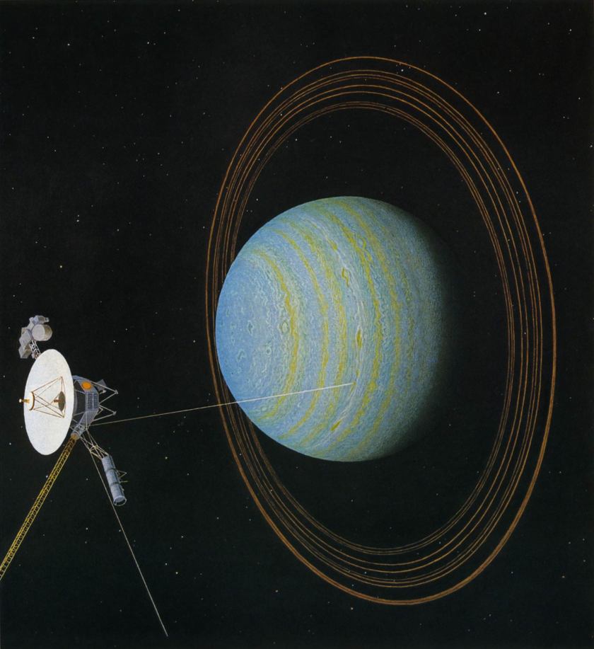 Vue d’artiste de la sonde Voyager 2 près d’Uranus en 1986. Crédit : Nasa/JPL